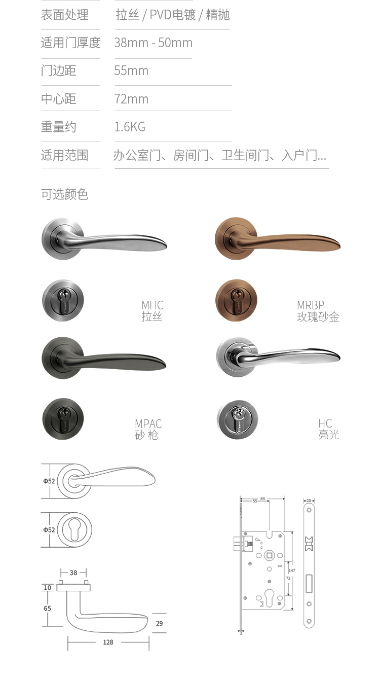 • 產(chǎn)品顏色:拉絲MHC、亮光HC、玫瑰砂金MRBP、砂槍MPAC