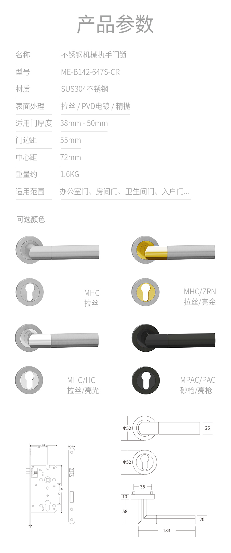 > 機(jī)械門(mén)鎖 Mechanical Lever Lockset - Stainless Steel > B142系列-(夾心式螺紋圈蓋結(jié)構(gòu)) > 產(chǎn)品詳細(xì)